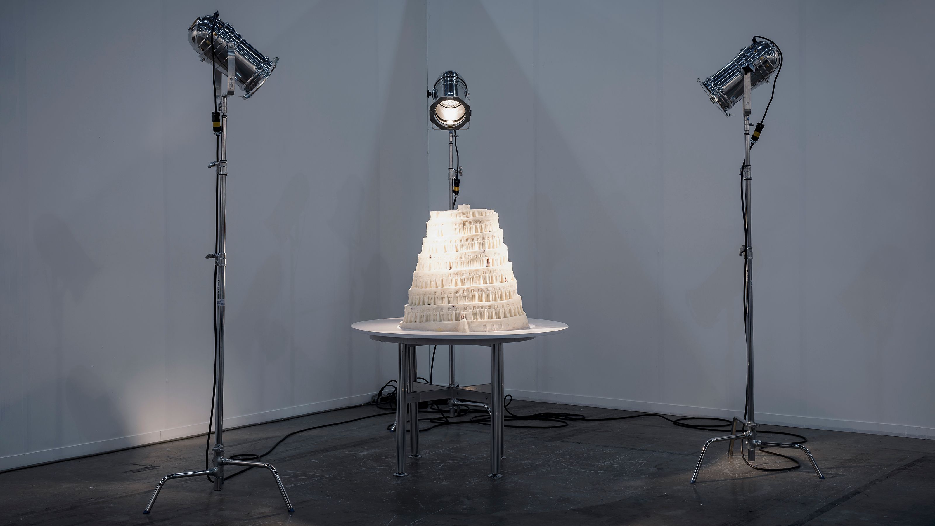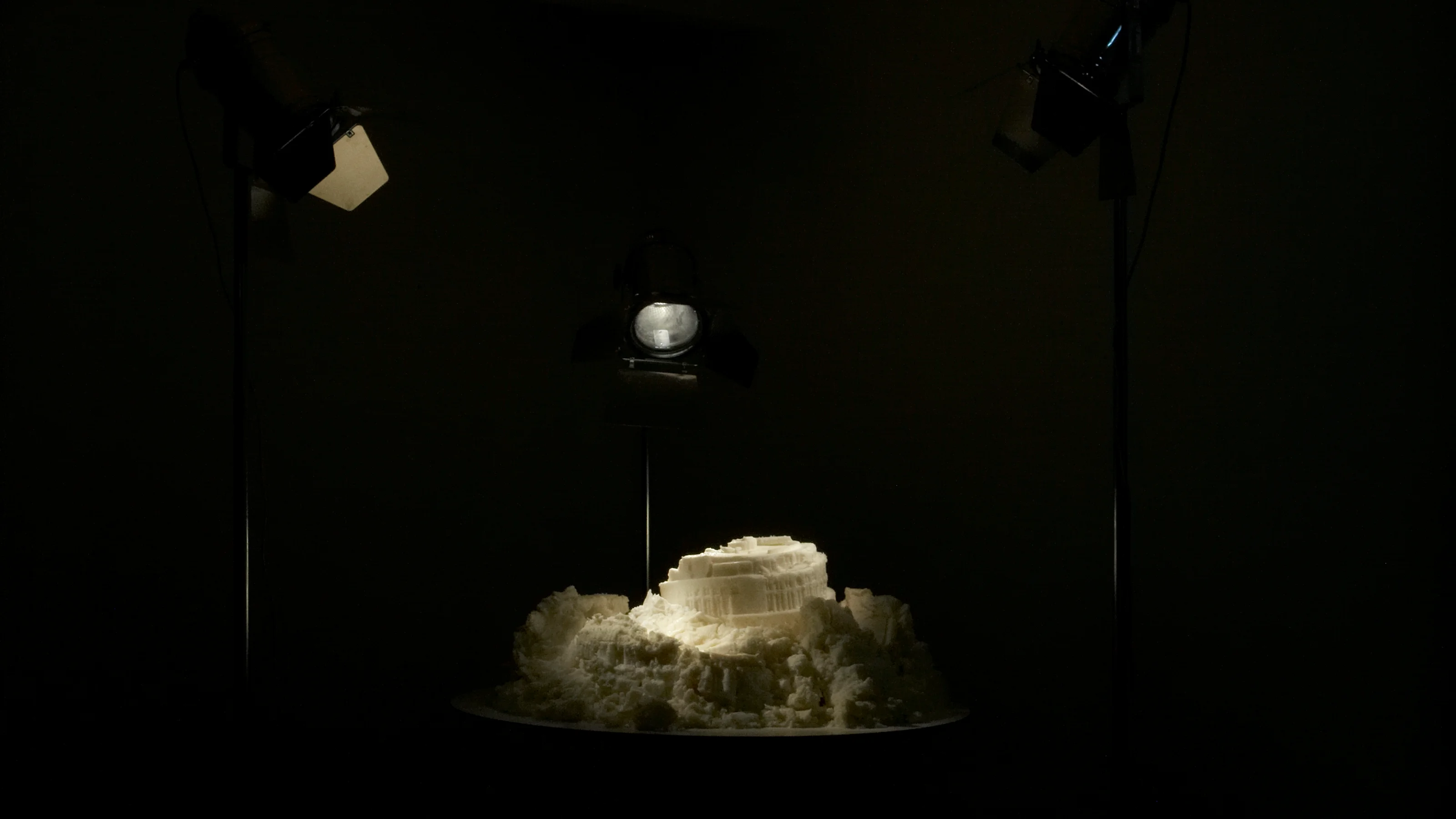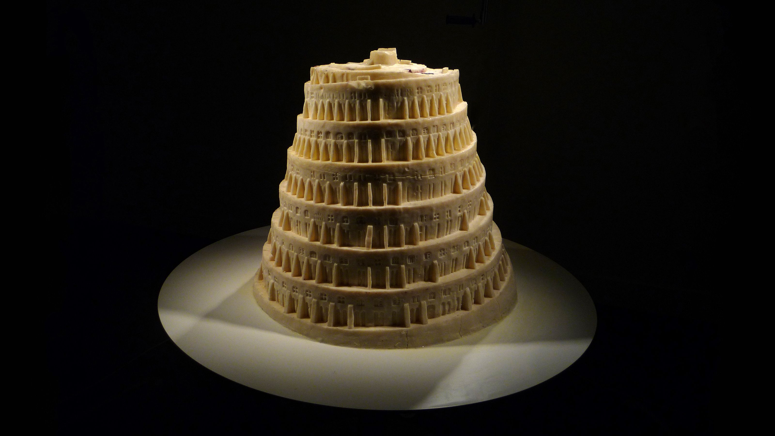 Inspired by the short-lived early–mid 20th-century practice of “White Art,” which, among other materials, used lard to create objects for window displays, this sculpture—made of fat and bones—reinterprets The Tower of Babel by Pieter Brueghel the Elder (1563). Exposed to the heat of theatre lamps, it slowly melts, echoing the Tower’s symbolism of the cycles of human ambition and hubris that with time become frail and inevitably decay. The work has no definitive moment, let alone a fixed conclusion: it is as valid in its construction as in its collapse, as well as in its state of flux.
