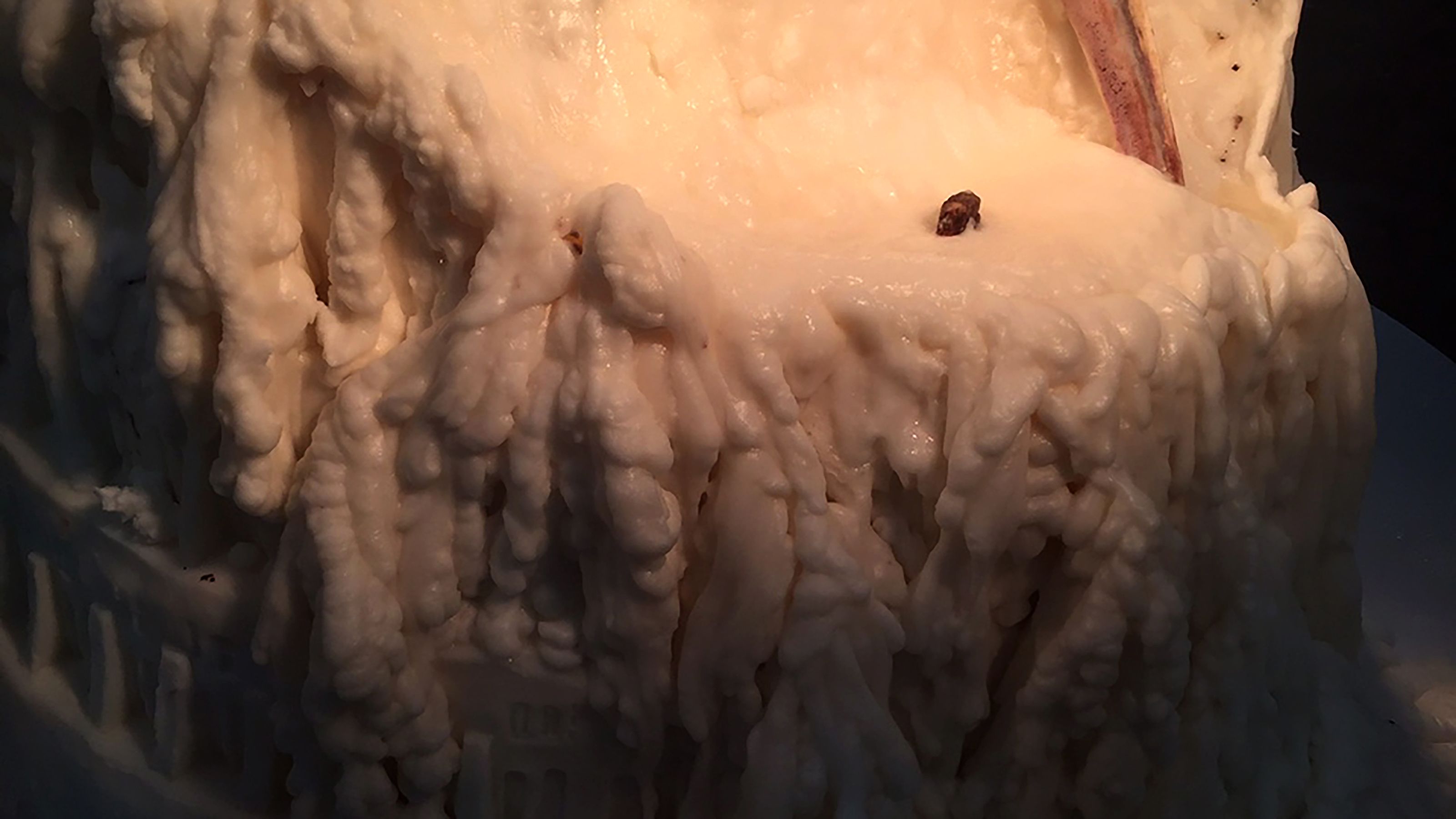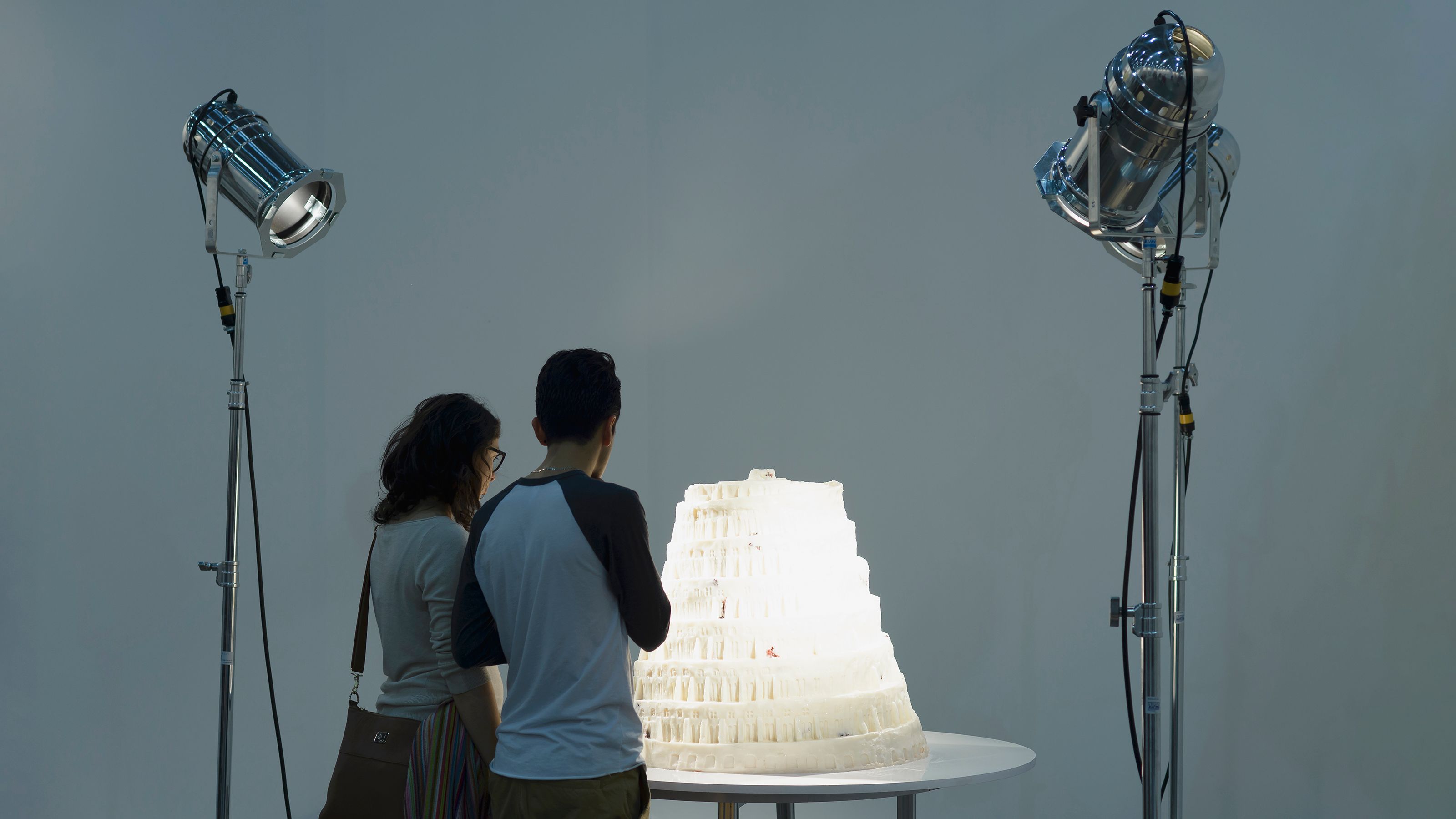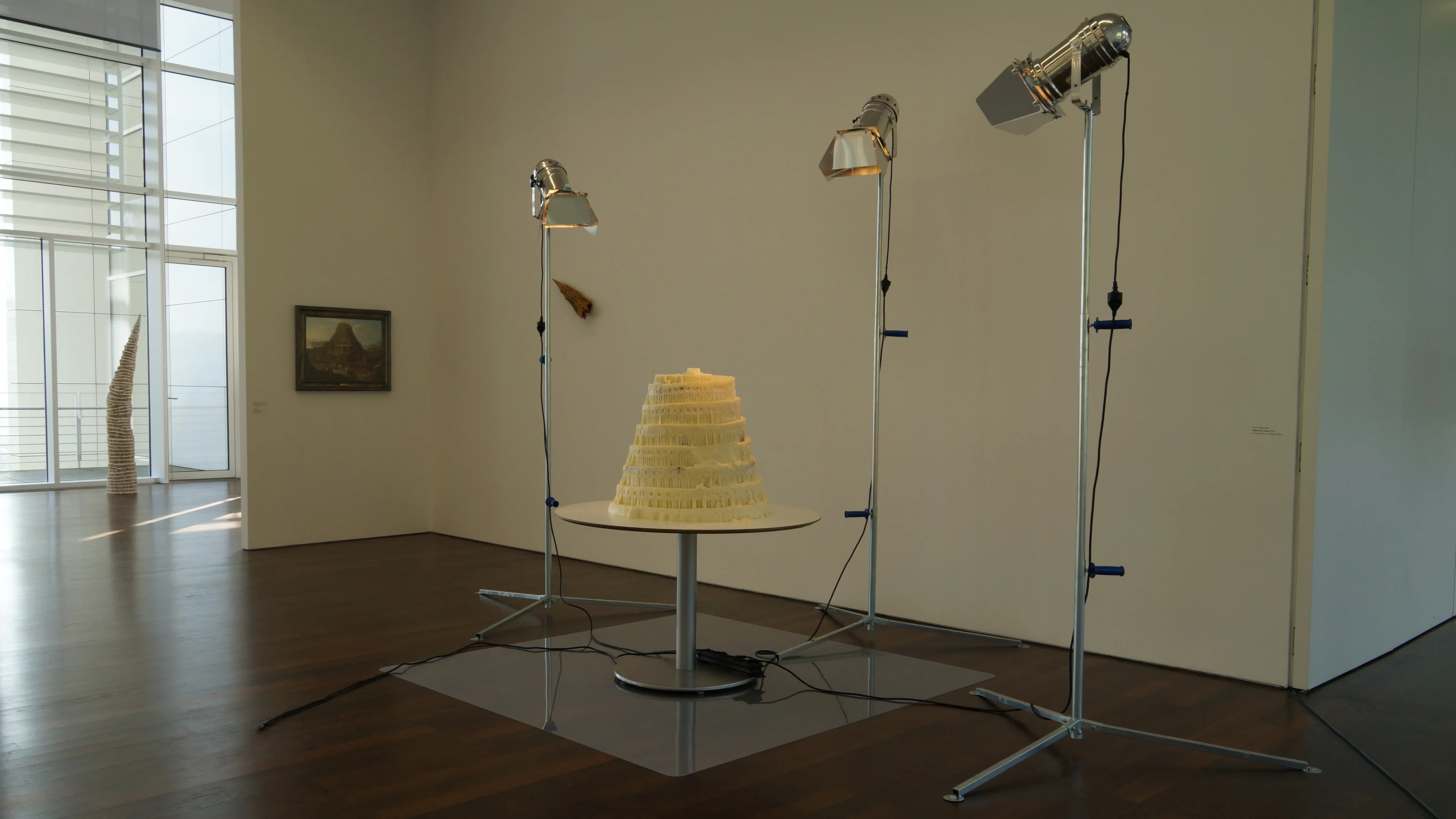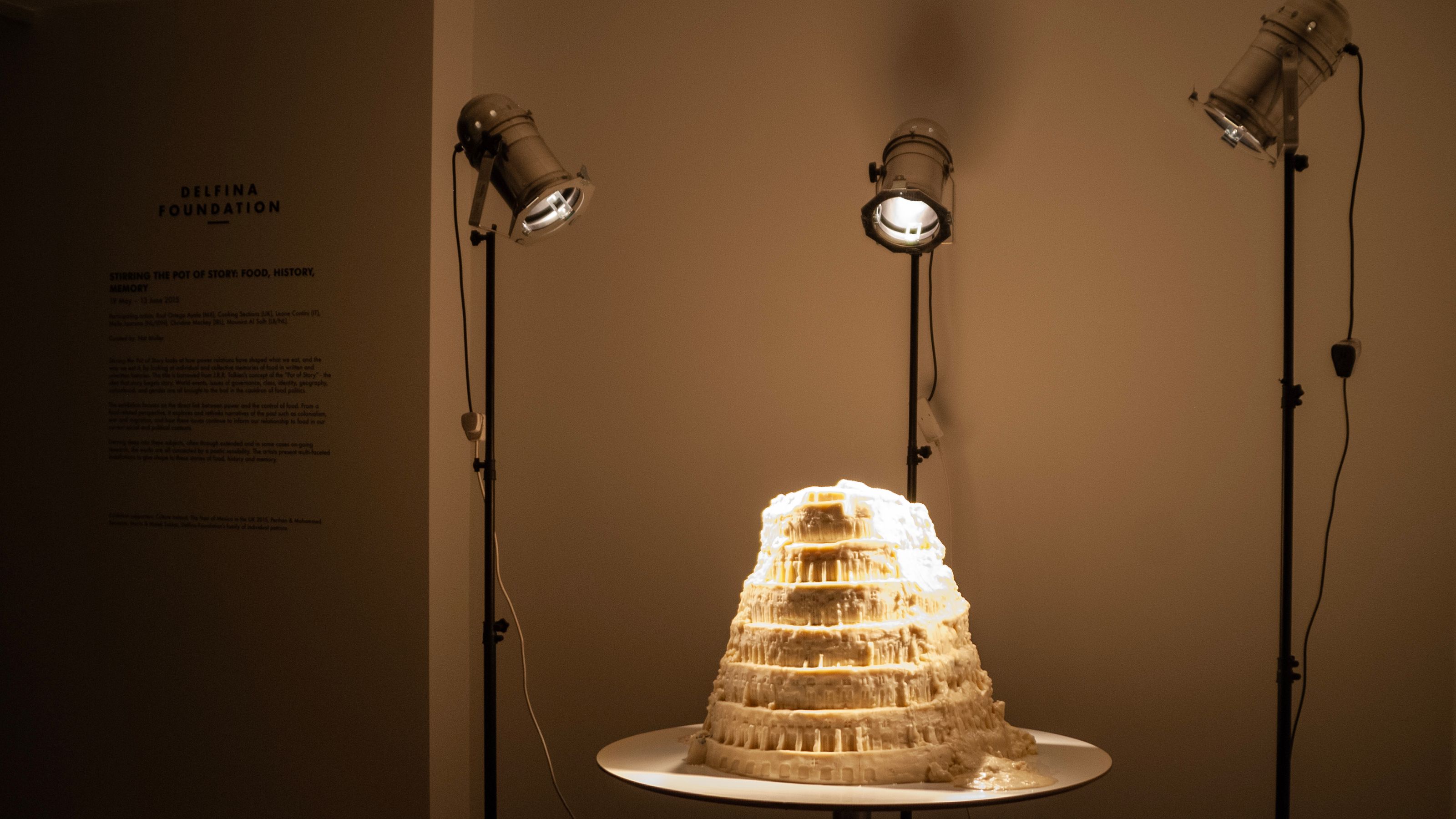 Inspired by the short-lived early–mid 20th-century practice of “White Art,” which, among other materials, used lard to create objects for window displays, this sculpture—made of fat and bones—reinterprets The Tower of Babel by Pieter Brueghel the Elder (1563). Exposed to the heat of theatre lamps, it slowly melts, echoing the Tower’s symbolism of the cycles of human ambition and hubris that with time become frail and inevitably decay. The work has no definitive moment, let alone a fixed conclusion: it is as valid in its construction as in its collapse, as well as in its state of flux.